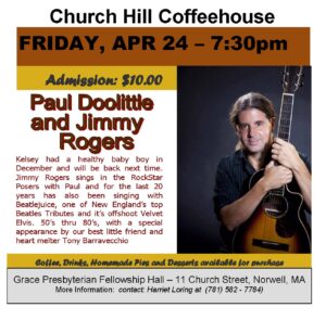 April 24, 2026 – Church Hill Coffeehouse, 7:30pm at Grace Presbyterian Church, 11 Church St, Norwell, MA.
